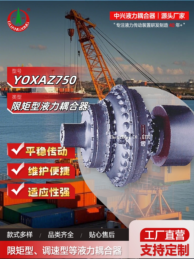 中興液力自主研發的YOXAZ750限矩型液力耦合器,憑借其創新設計與成熟技術,為港口裝卸起重機提供了一套高效、安全、耐用的動力傳動解決方案。